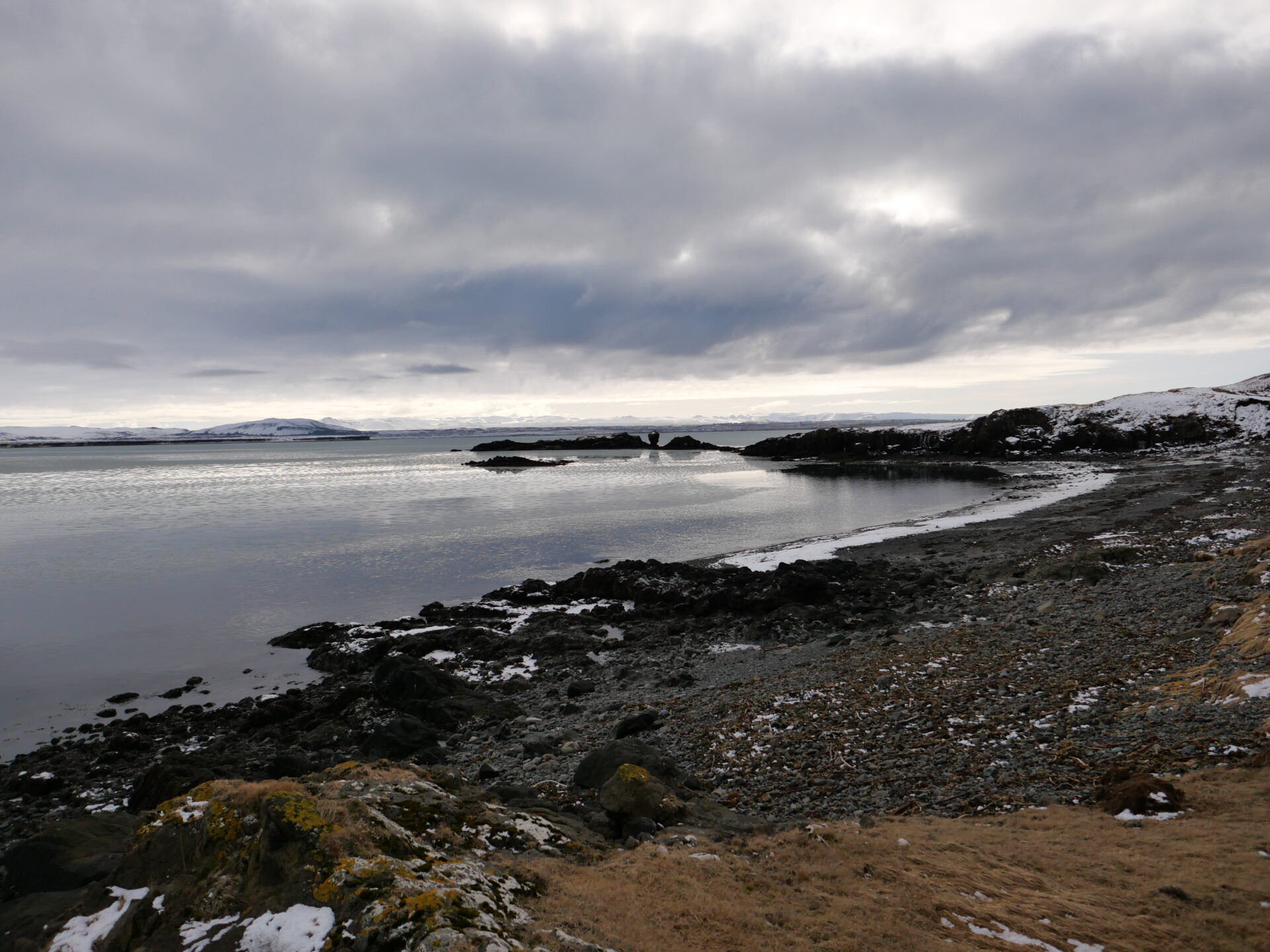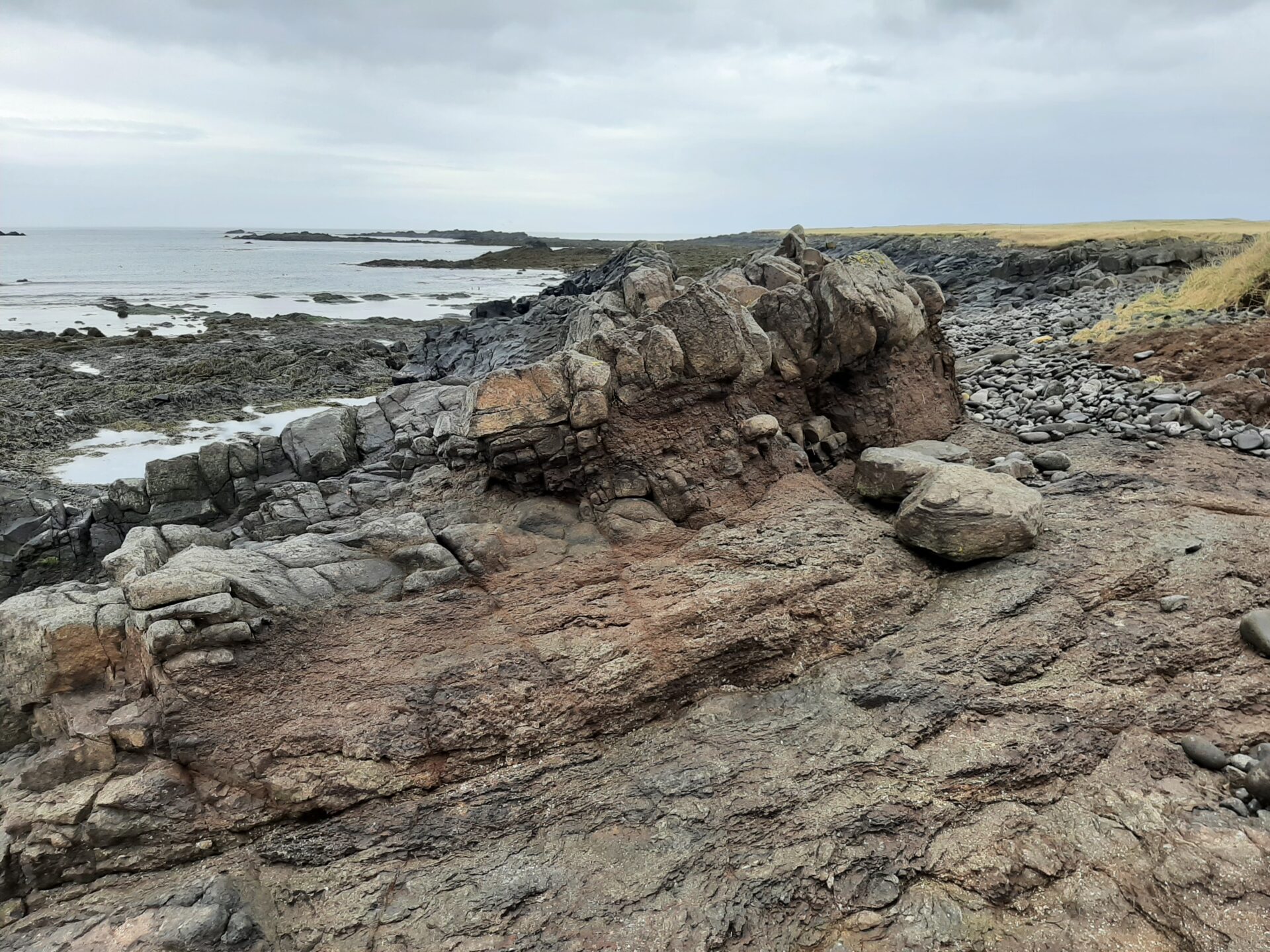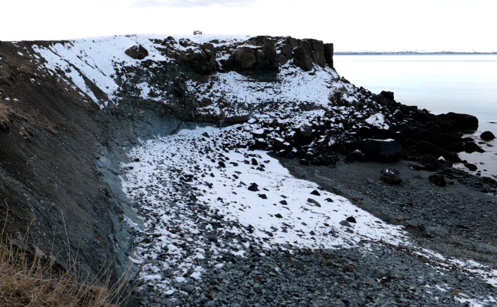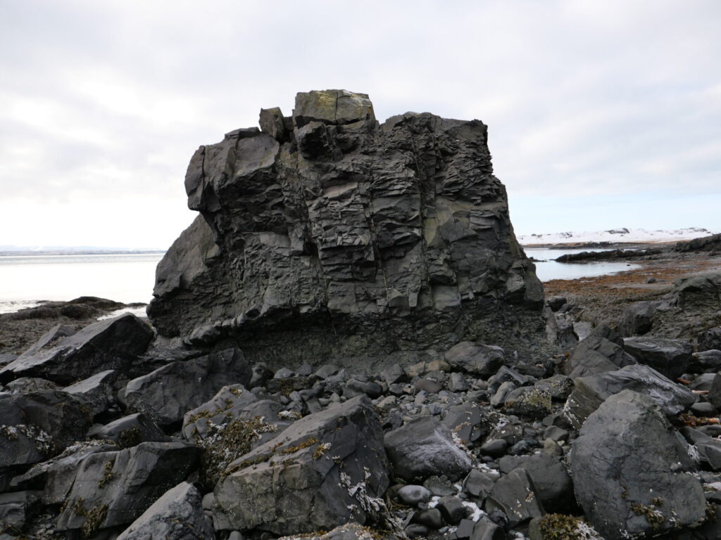 Við ströndina eru sérkennilegir klettar og litirnir eru fjölbreyttir – ekki bara steingráir.