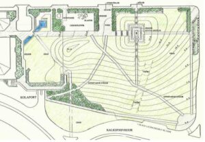 Athyglisvert: Fjórir garðar voru þarna sameinaðir í einn með bogalaga stígum og beðum. Þarna var líka lítil tjörn, gosbrunnur og lítið garðhús. Því miður þurfti að fjarlægja tjörnina. Fólk var hrifið af þessum fallega garði og áttaði sig á mikilvægi þess að teikna garða og skipuleggja.